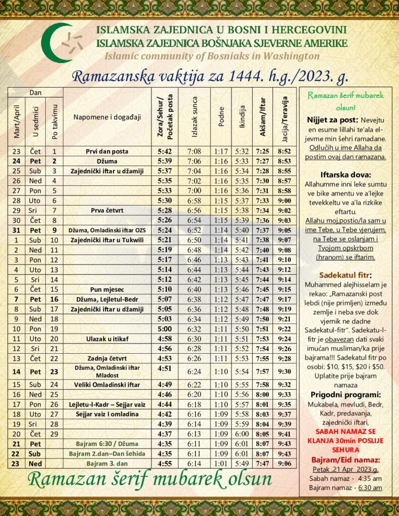 Ramazan u 2023 godini (1444 h.g) počinje u četvrtak 23. marta i traje do 20. aprila. Obratite pažnju na rubriku napomene i događaji na vaktiji, kako biste se informisali o važnim datumima i događajima tokom mjeseca ramazana.